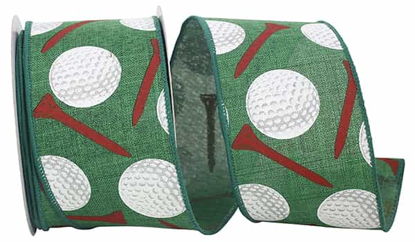 Golf Balls and Tees Linen Wired Edge Ribbon - Green Color -- 2.5" x 10 Yards