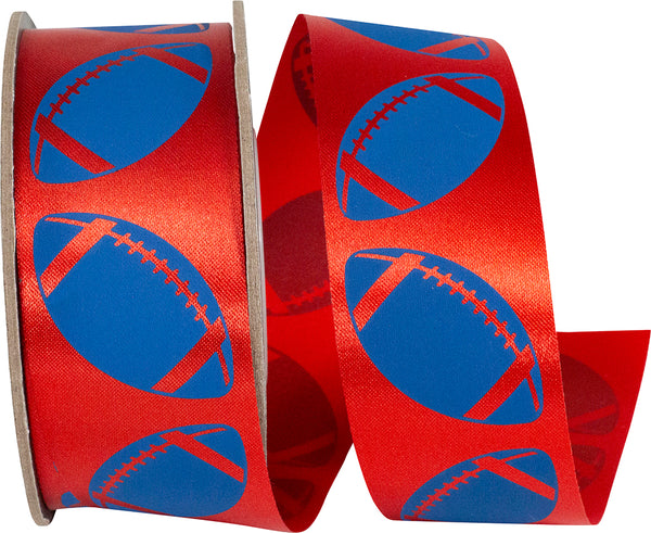 Featuring bold, royal-colored football graphics against a smooth, red background, this ribbon brings a classic, high-contrast look to your homecoming crafts and sports-themed decorations. Its firm finish makes it ideal for structured designs and cooler-style arrangements.