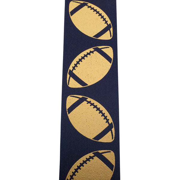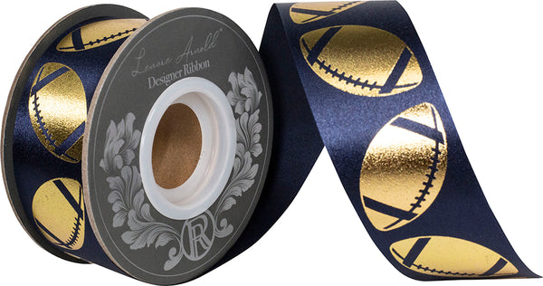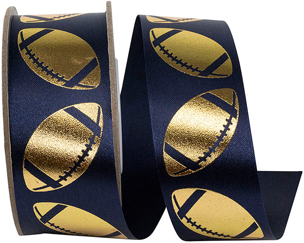 Featuring bold metallic gold footballs printed on sleek navy polyester with a firm finish, this ribbon delivers drama, contrast, and high-impact shine. Its narrow width makes it ideal for corsages, favors, treat bags, centerpieces, and detailed bow work.