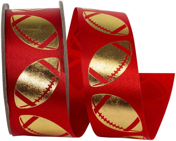 Featuring bold metallic gold footballs printed on sleek red polyester with a firm finish, this ribbon delivers drama, contrast, and high-impact shine. Its narrow width makes it ideal for corsages, favors, treat bags, centerpieces, and detailed bow work.