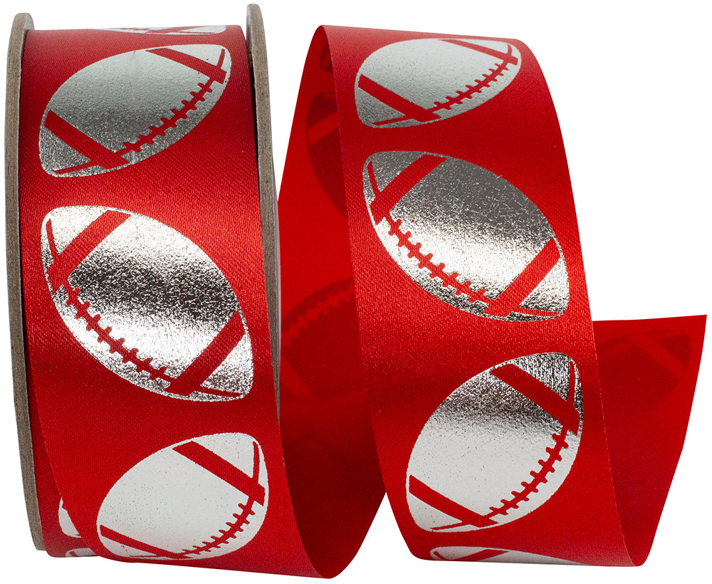 Homecoming Metallic Footballs Cooler Ribbon –- Red / Silver Color -- 1⅜" x 25 Yards