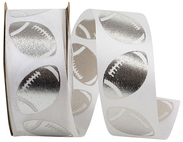 Footballs Tossed Satin Cooler Ribbon –- White / Silver Color -- 1⅜" x 25 Yards