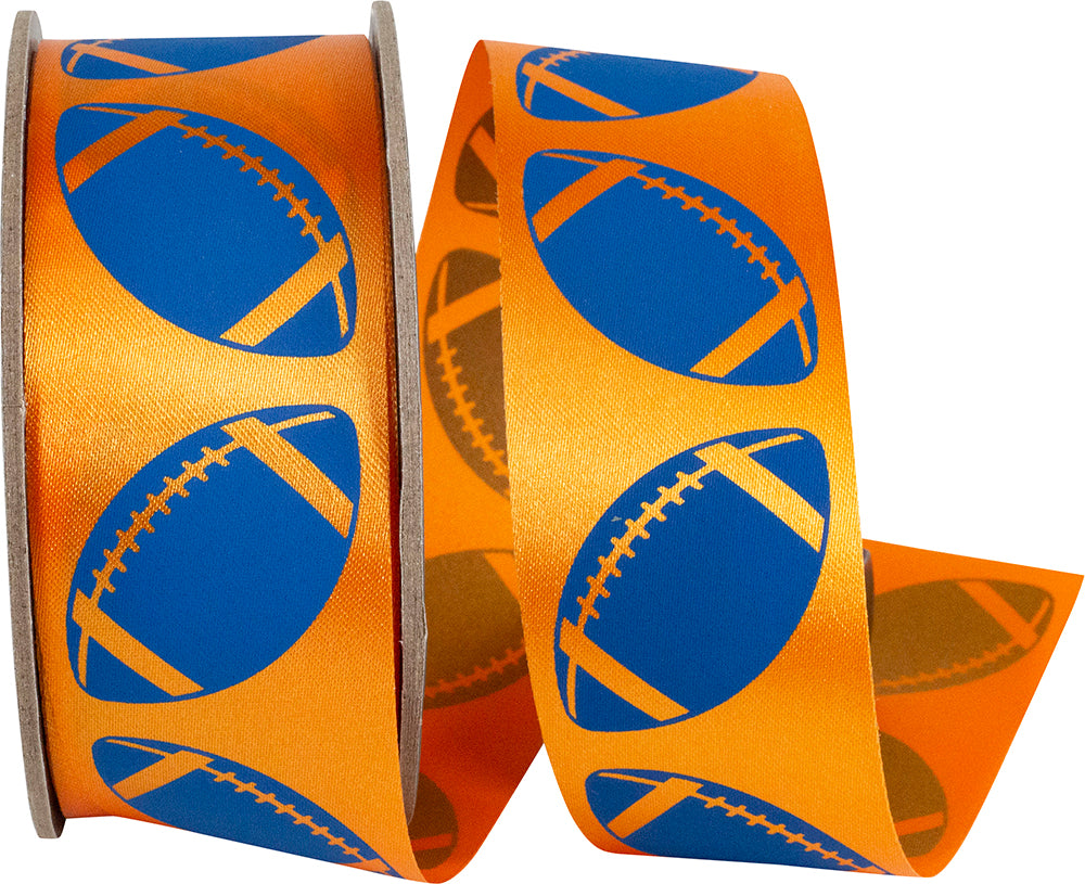 Homecoming Matte Footballs Cooler Ribbon –- Orange / Royal Color -- 1⅜" x 25 Yards