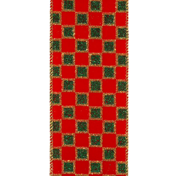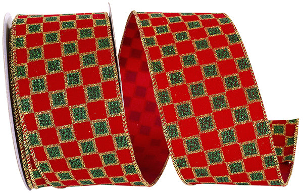 - Red velvet ribbon with alternating green glitter squares outlined in metallic gold.