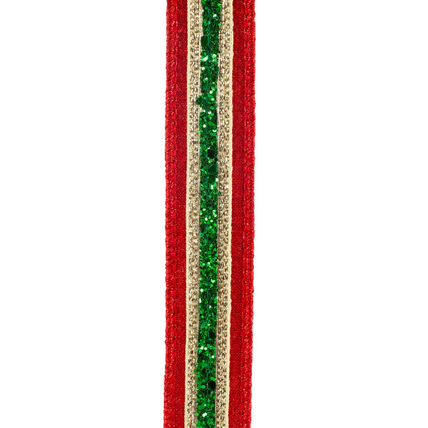 - A narrow red velvet-style ribbon with a bold green glitter stripe and gold metallic borders.